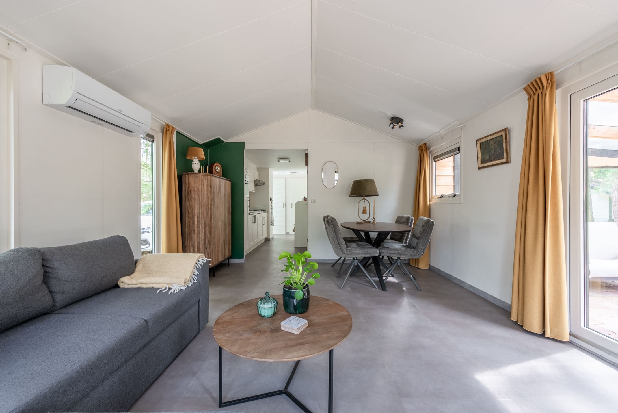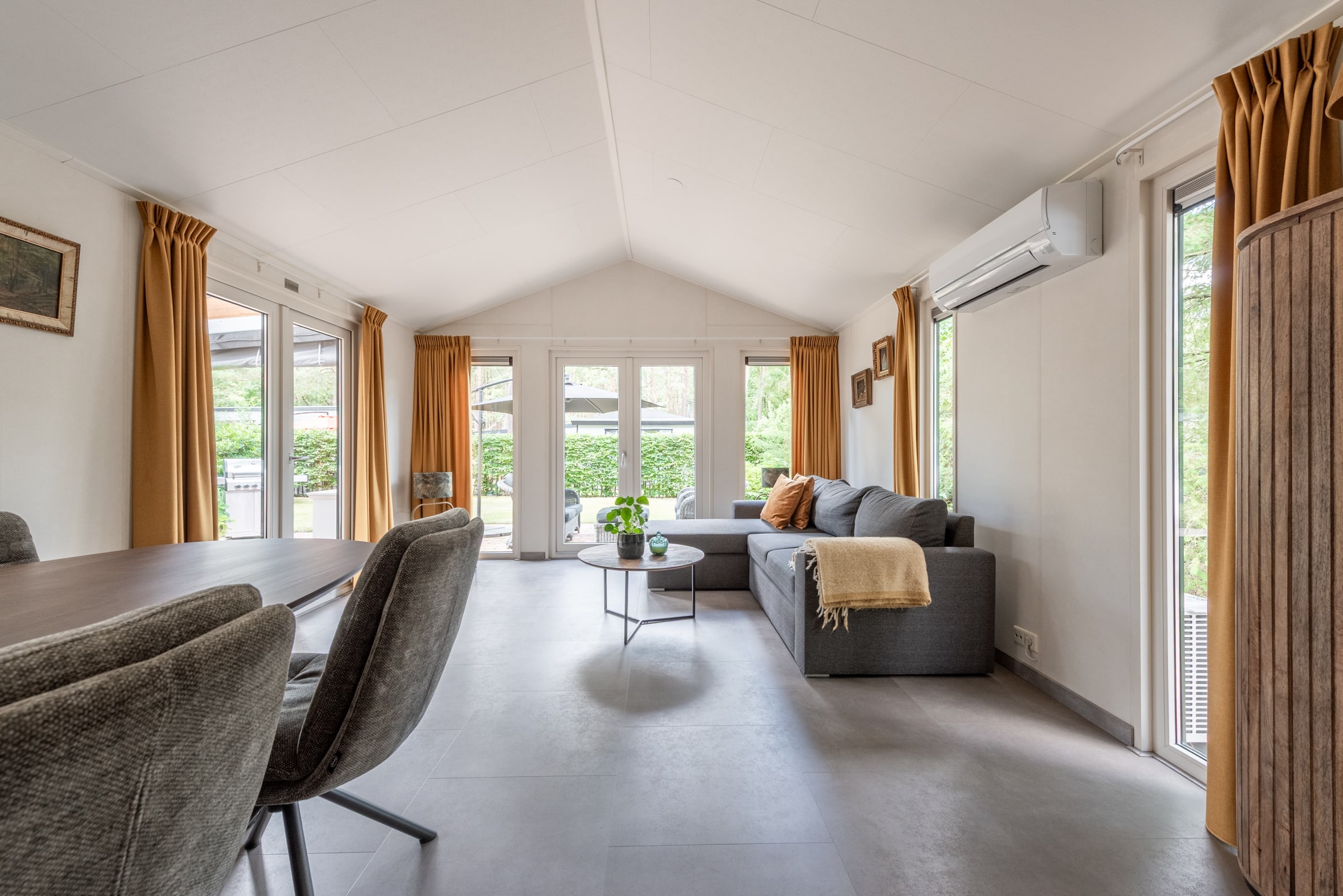 In de ruime woonkamer bevinden zich tuindeuren die leiden naar de tuinkamer en tevens tuindeuren die naar een extra terras gaan. De Mitsubishi 5 kw airconditioning, klimaat beheersing, die zorgt voor koelen, verwarmen en ontvochtigen, is geplaatst in 2024.