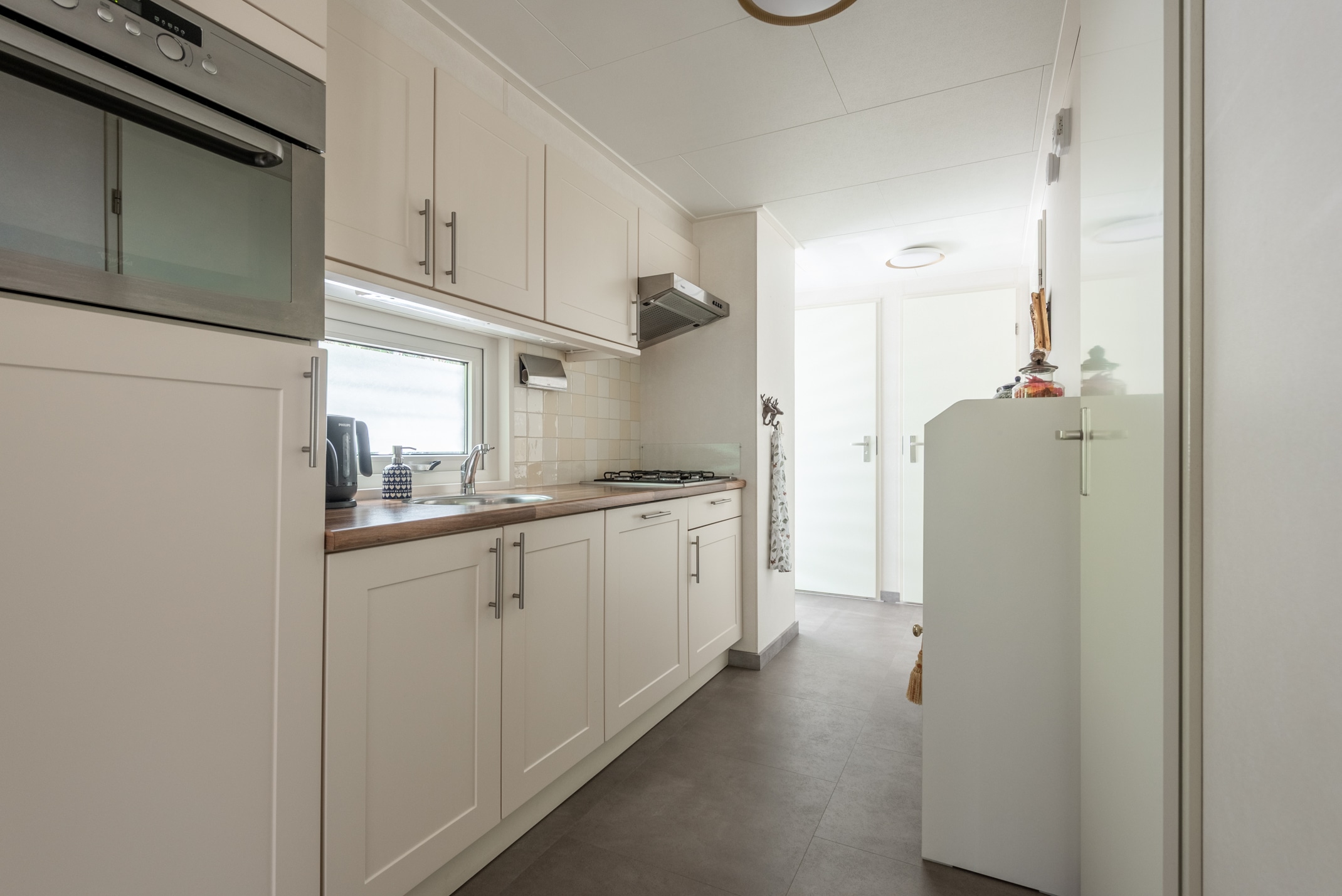 Teruglopend naar de  keuken waar u diverse inbouwapparatuur vindt, zoals een combi magnetron, koelkast met vriesvak, een vierpits gaskookplaat en een RVS afzuigkap.