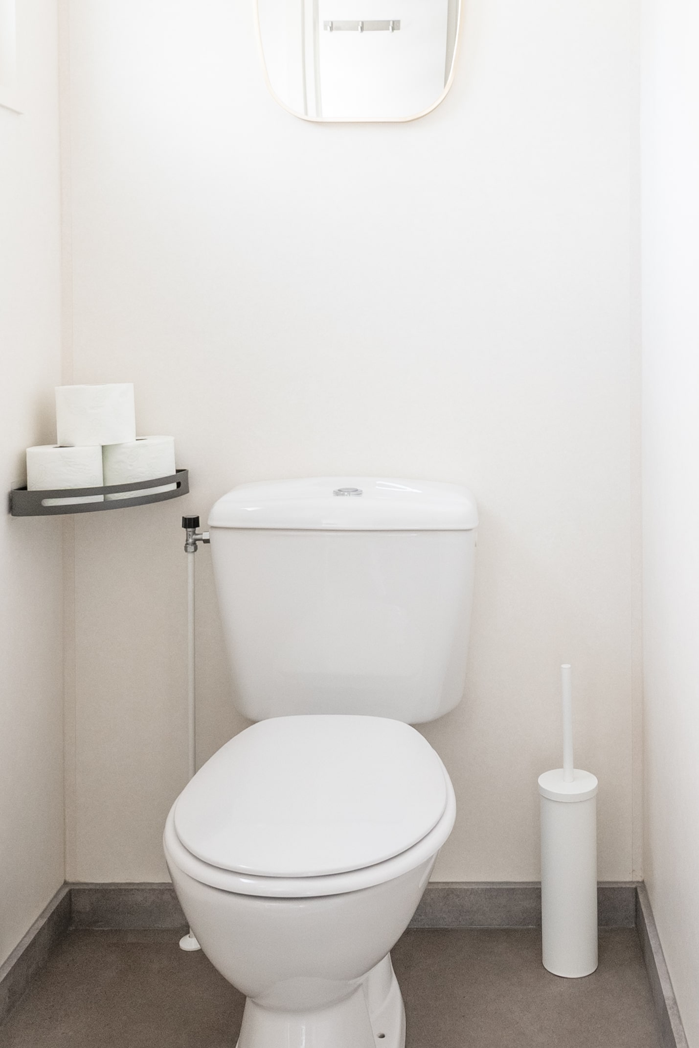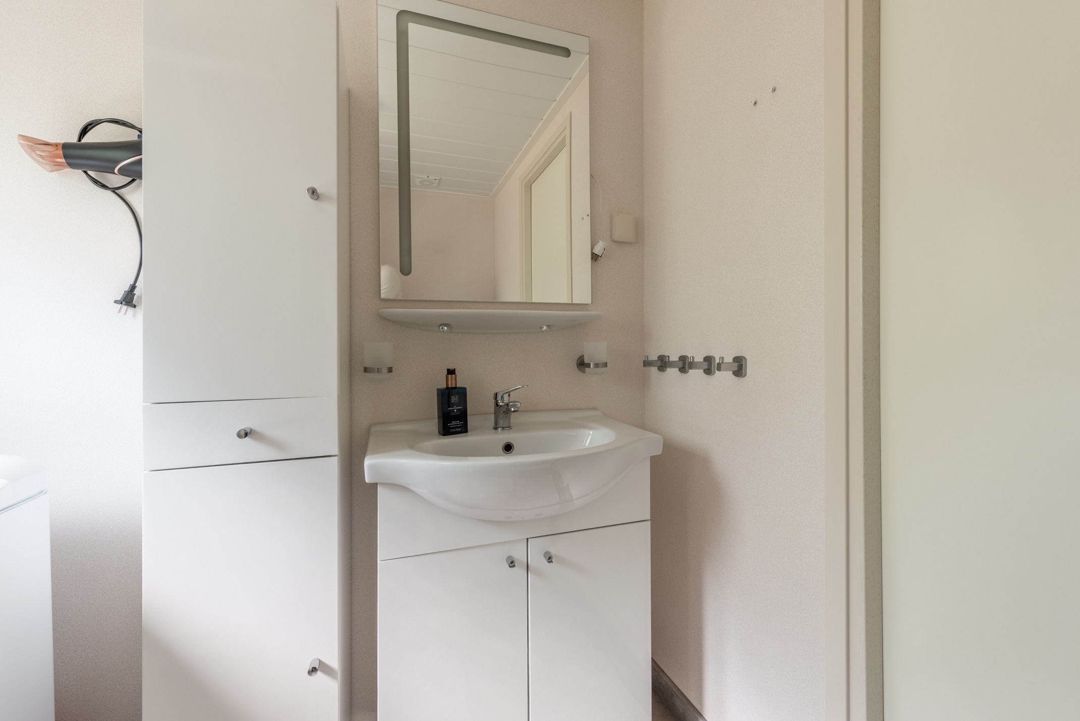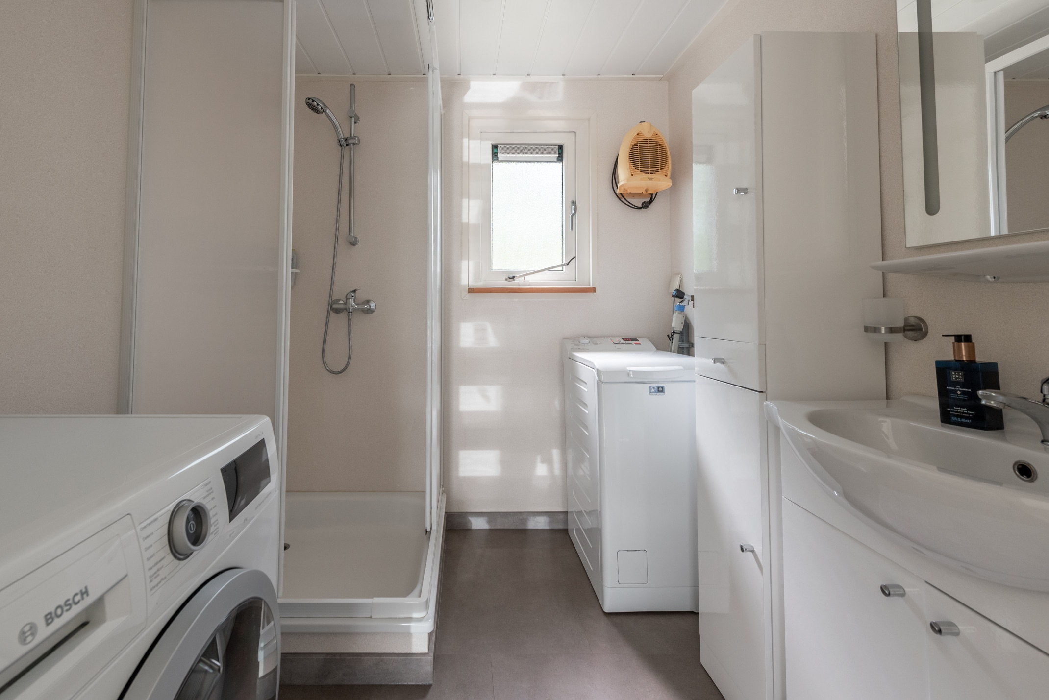 Binnenkomend via de bijkeuken bevindt zich rechts de badkamer  voorzien van een separate doucheruimte, een badkamermeubel en aansluiting voor een wasmachine en droger.