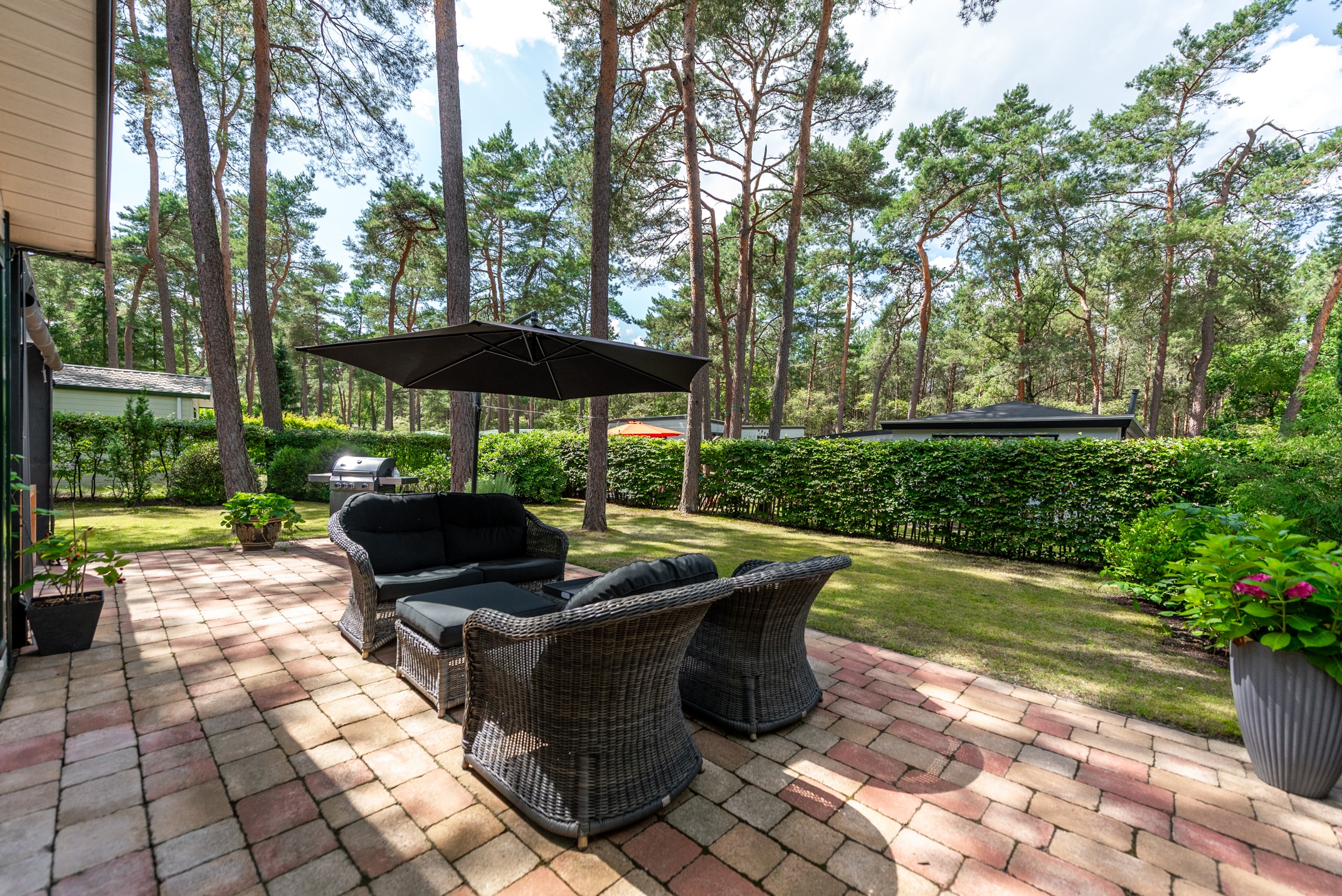 De gehele tuin is omheind met een haag die veel privacy geeft. Ook is de tuinkamer geheel betegeld met een mooie siersteen die ook om het huis ligt en waarmee het tweede terras betegeld is.