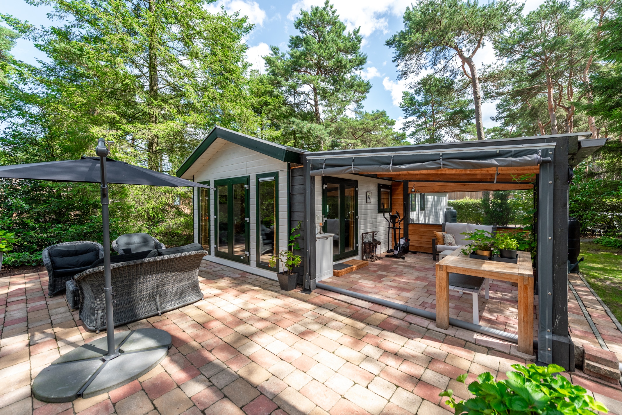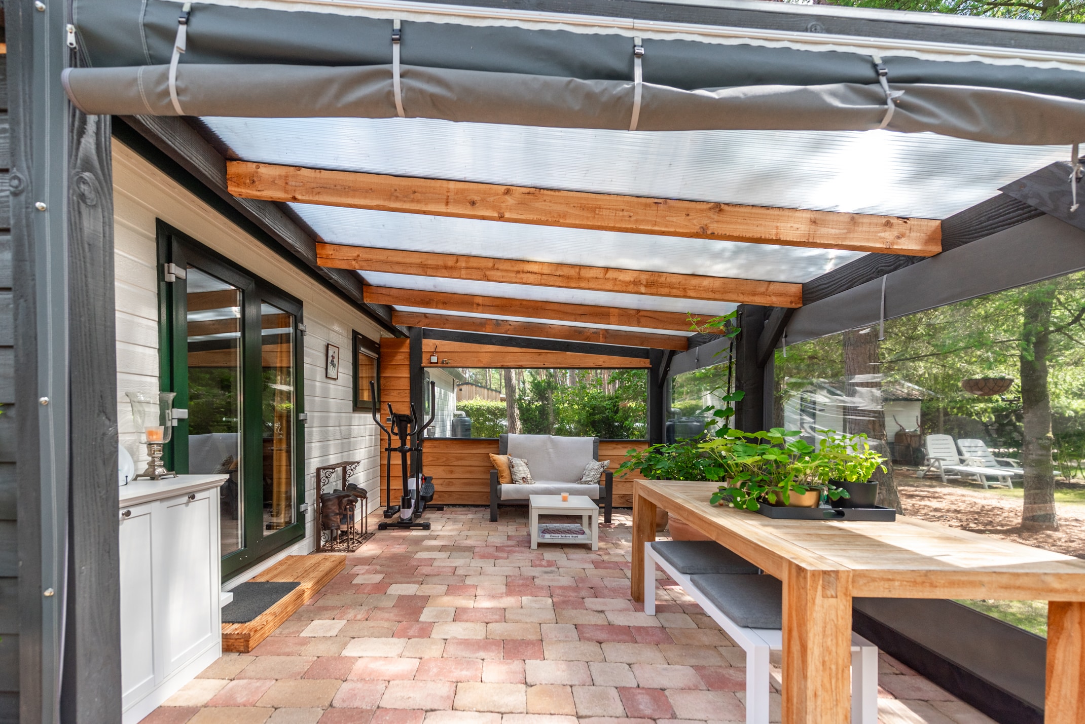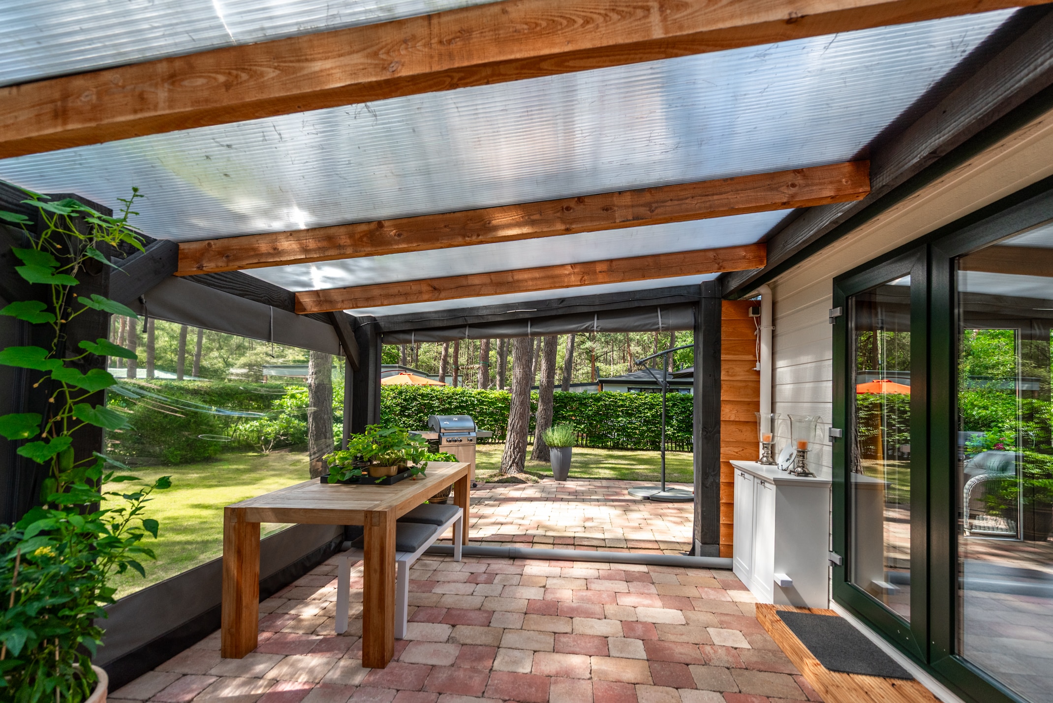 Ook heeft het object een overkapping die eigenlijk fungeert als luxe tuinkamer doordat de ruimte afsluitbaar is.