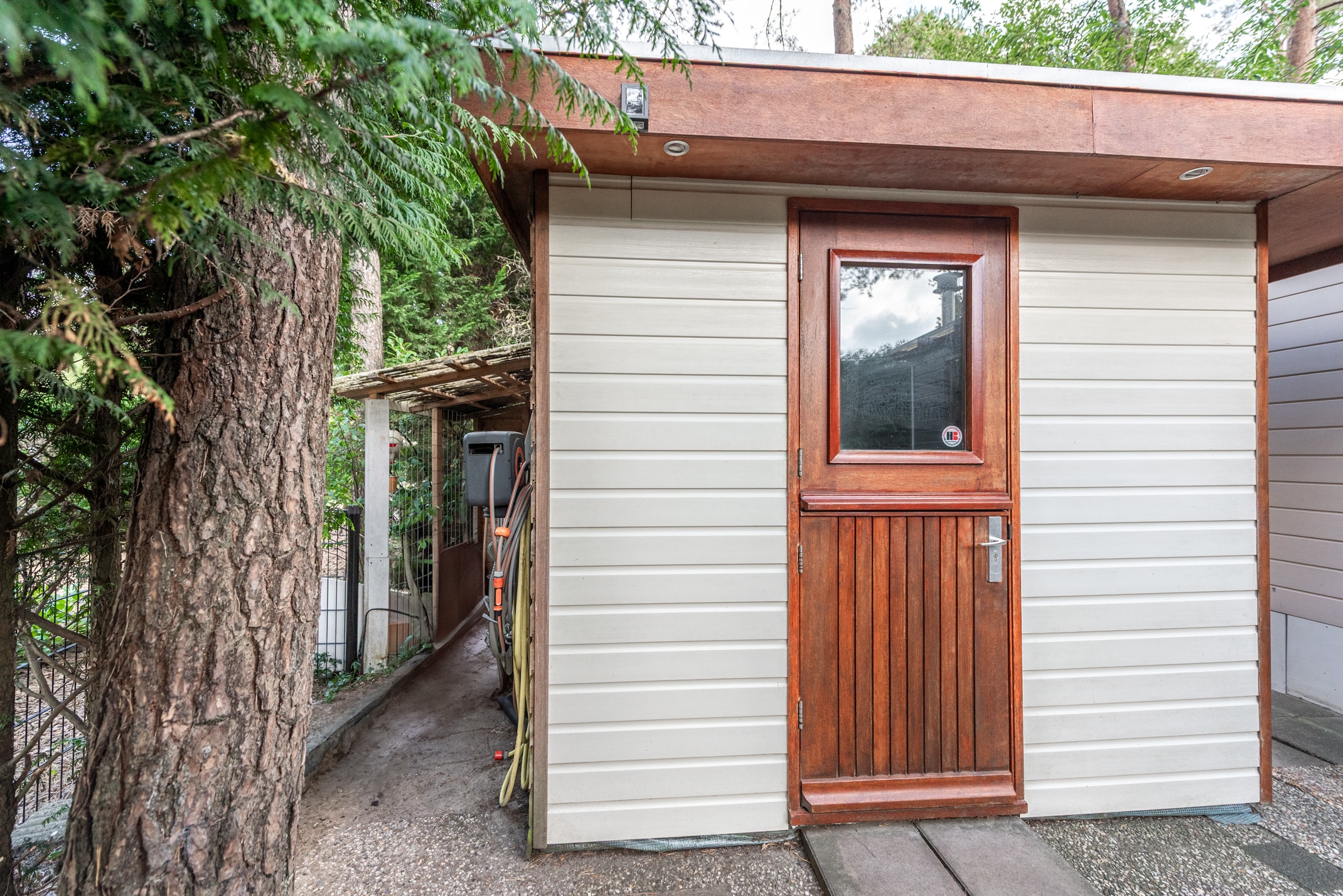 Buiten vinden we de berging waarin de wasmachine en droger staan en een tweede koel/vries combinatie, deze is geschikt voor gebruik bij vriezend weer.