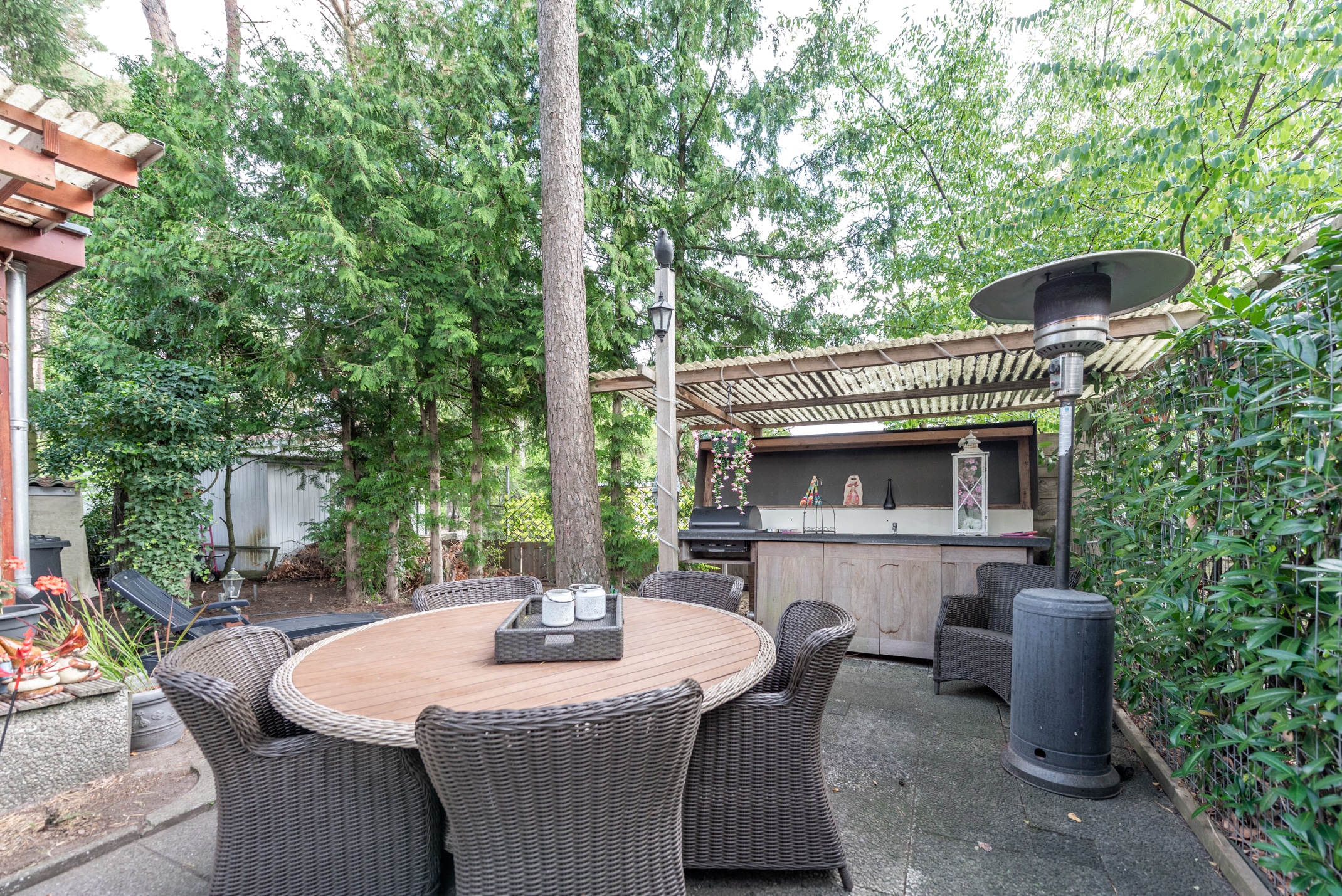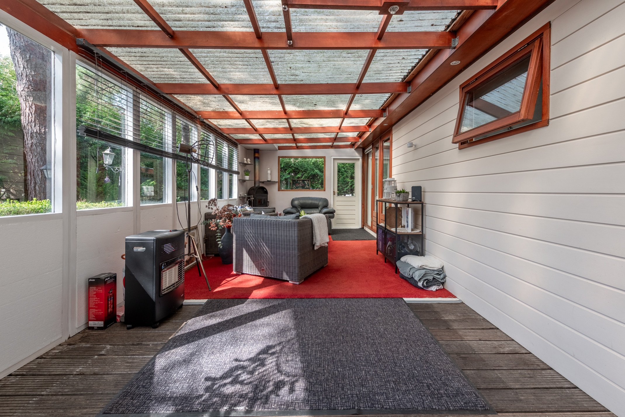 Over de gehele lengte van de woning is een overkapt terras met glaswanden en houtkachel.