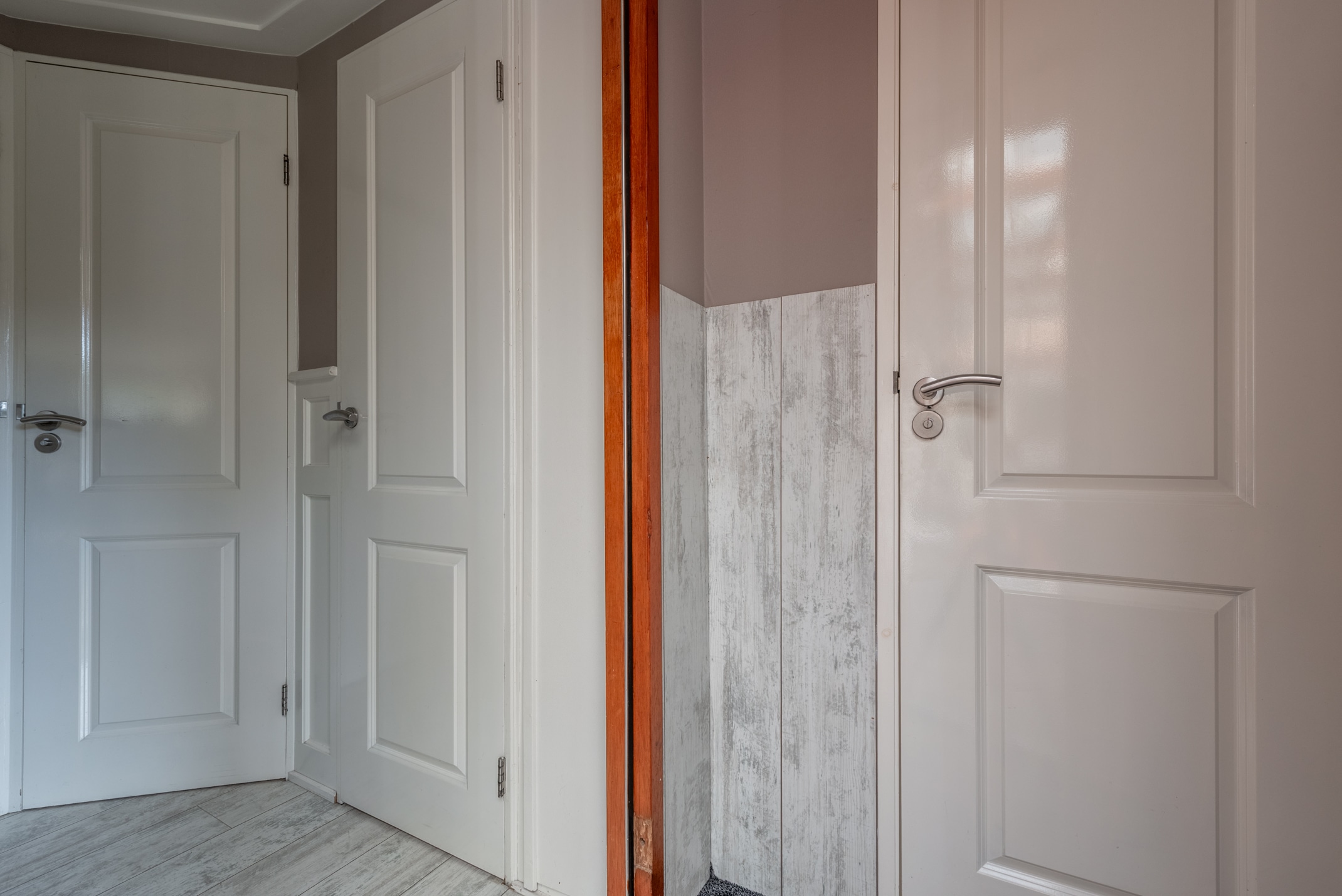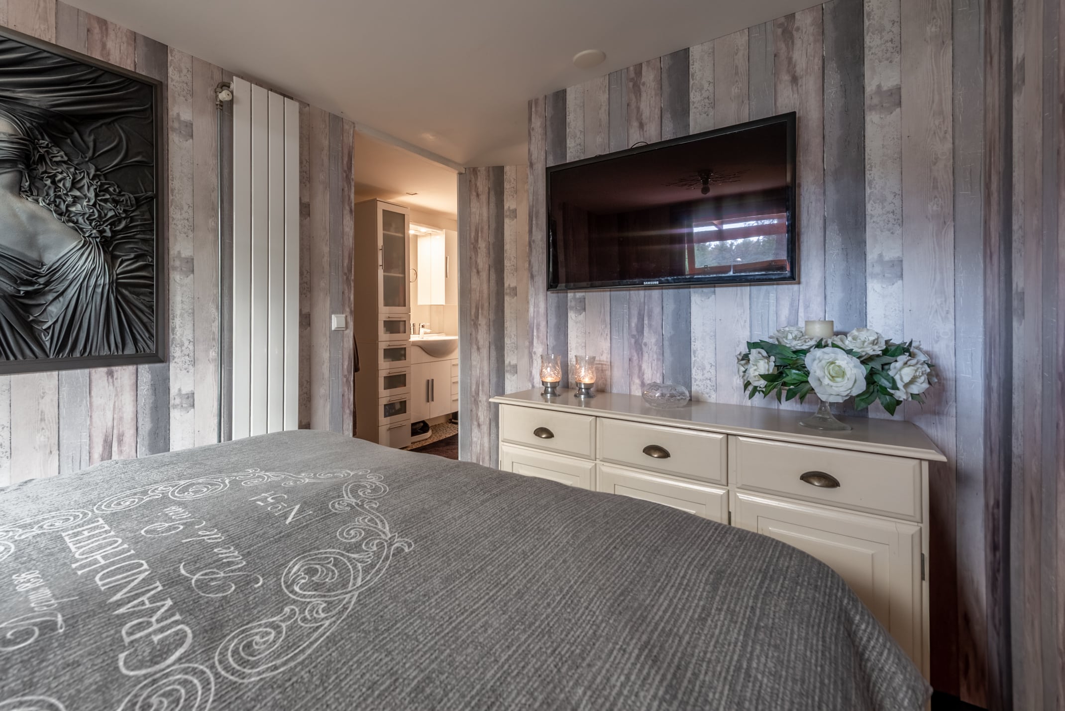 Vanuit de badkamer komt u in de grootste slaapkamer van de woning die aansluitend een walk-in closet heeft. Tevens heeft deze slaapkamer een televisie.
