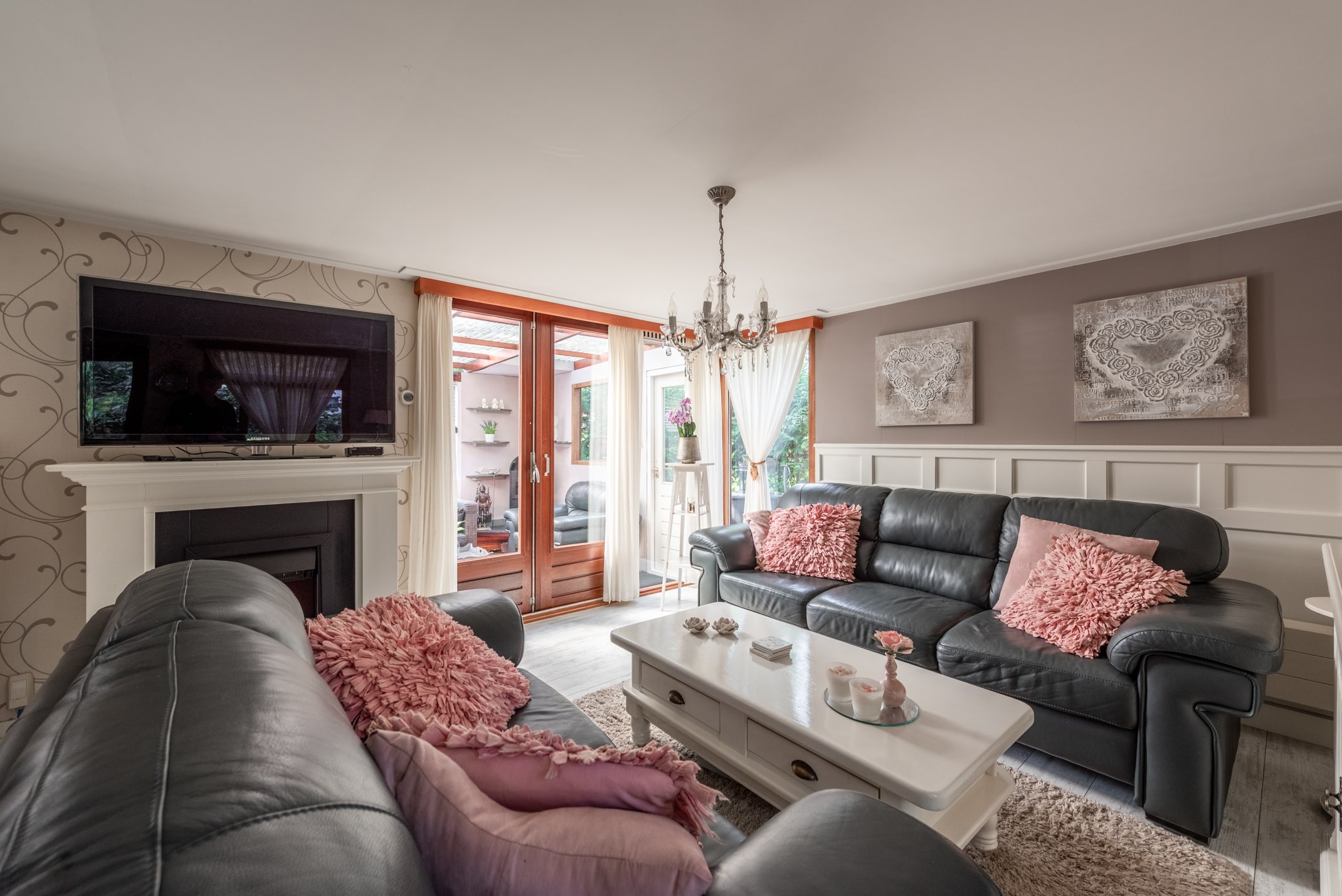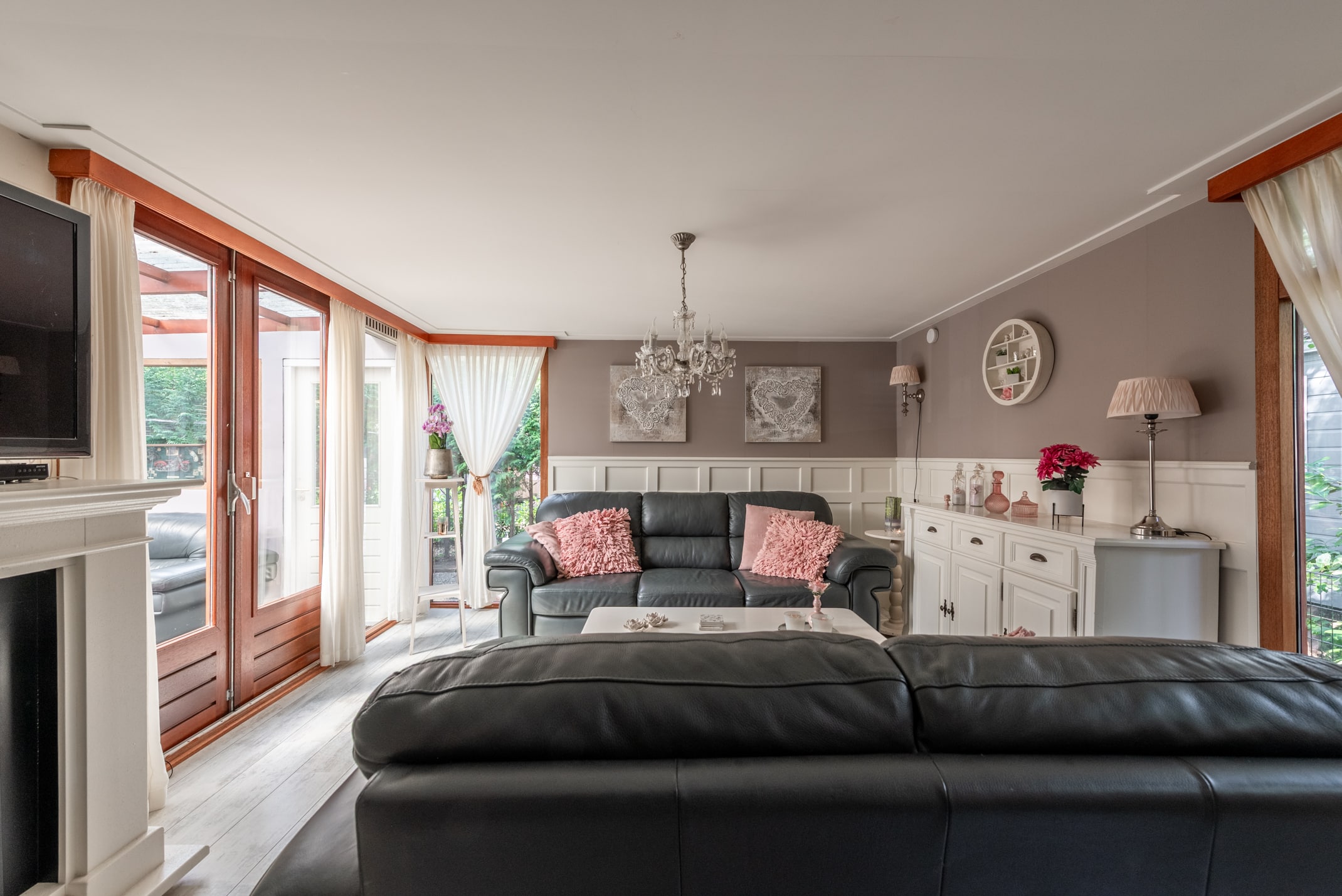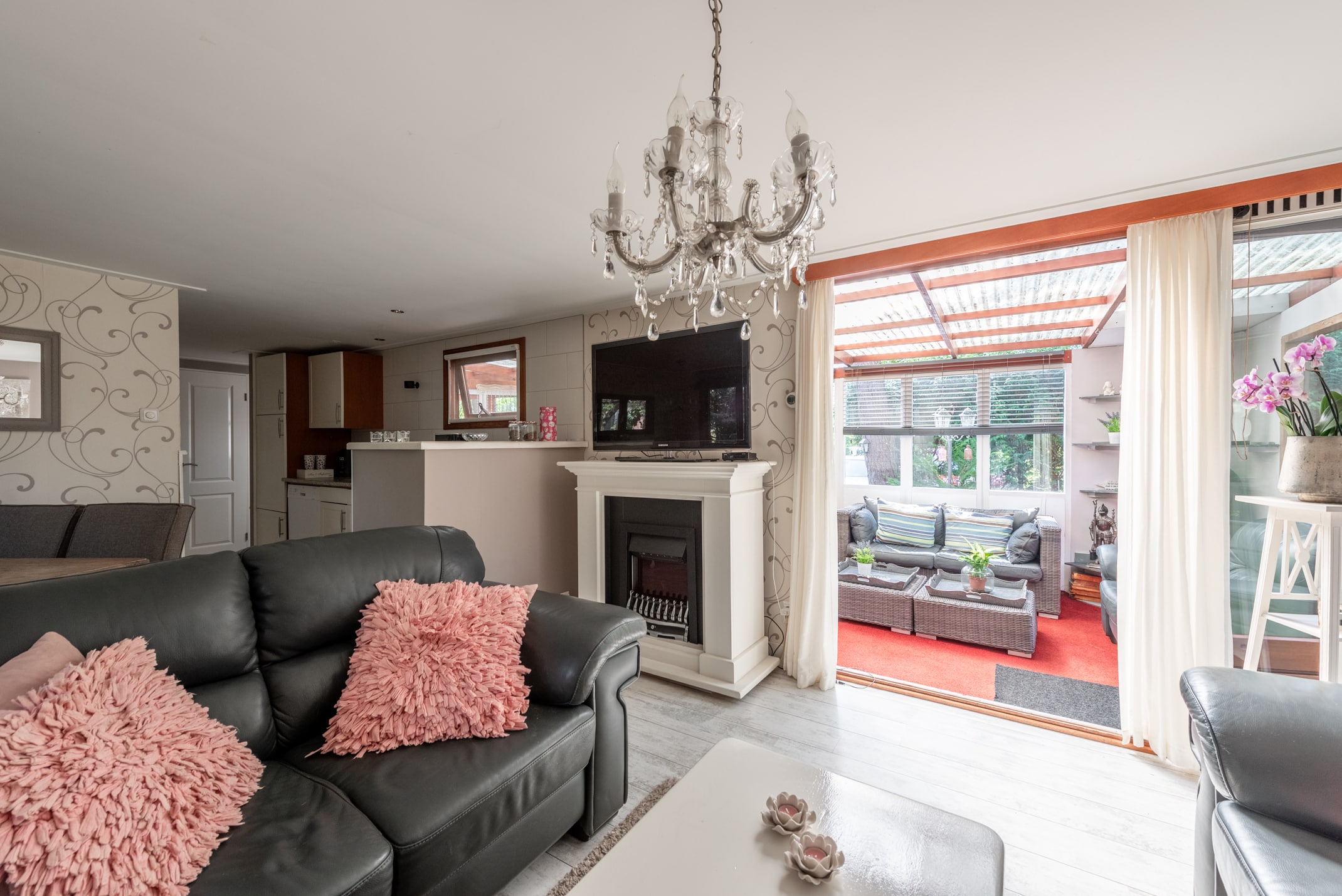 In de ruime woonkamer zijn de openslaande deuren naar het overdekte terras voorzien van een houtkachel. De woonkamer en keuken zijn beide voorzien van een stucplafond en lambrisering.
