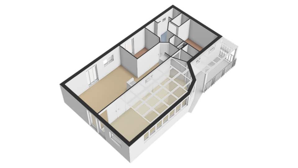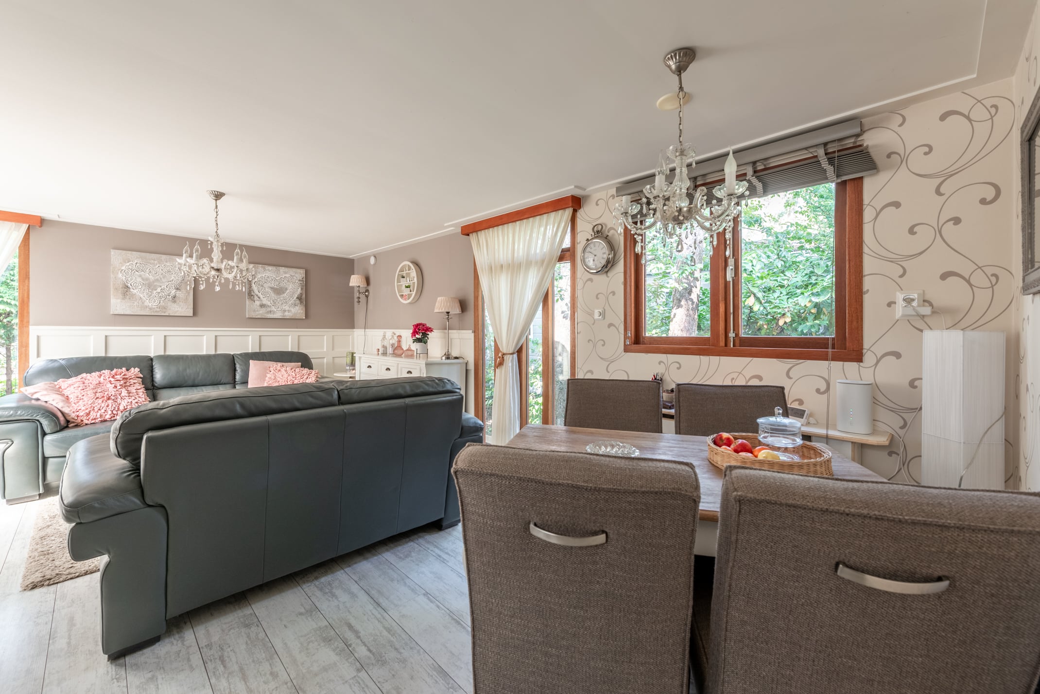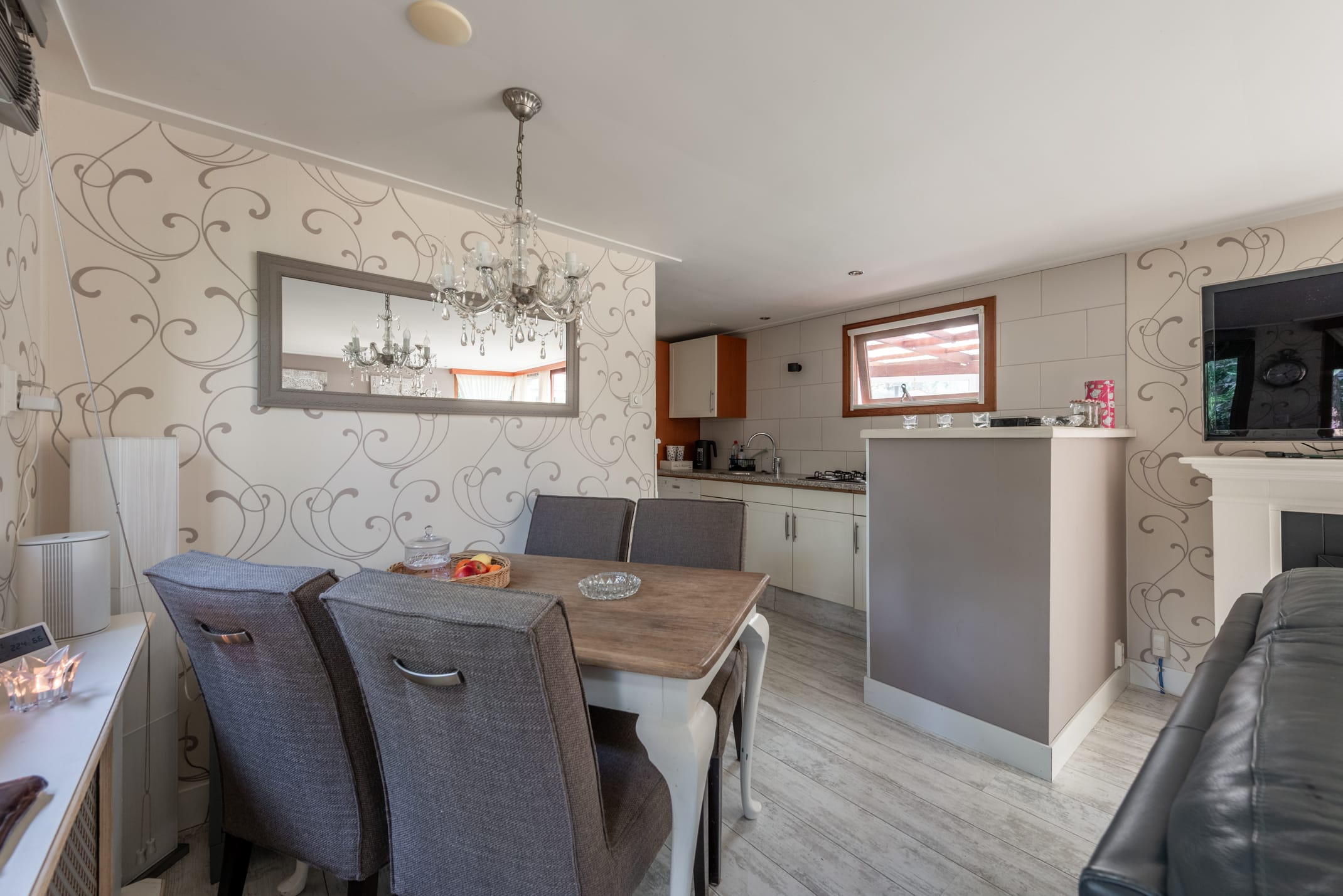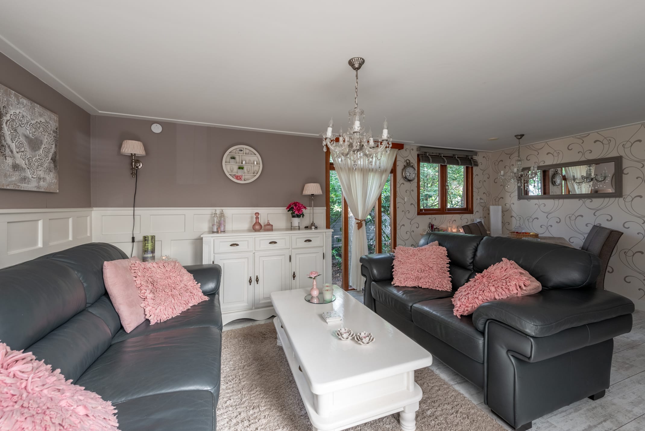 In de ruime woonkamer zijn de openslaande deuren naar het overdekte terras voorzien van een houtkachel. De woonkamer en keuken zijn beide voorzien van een stucplafond en lambrisering.
