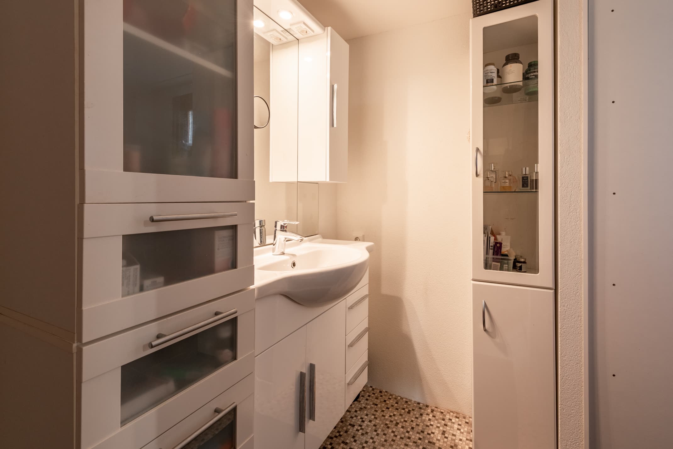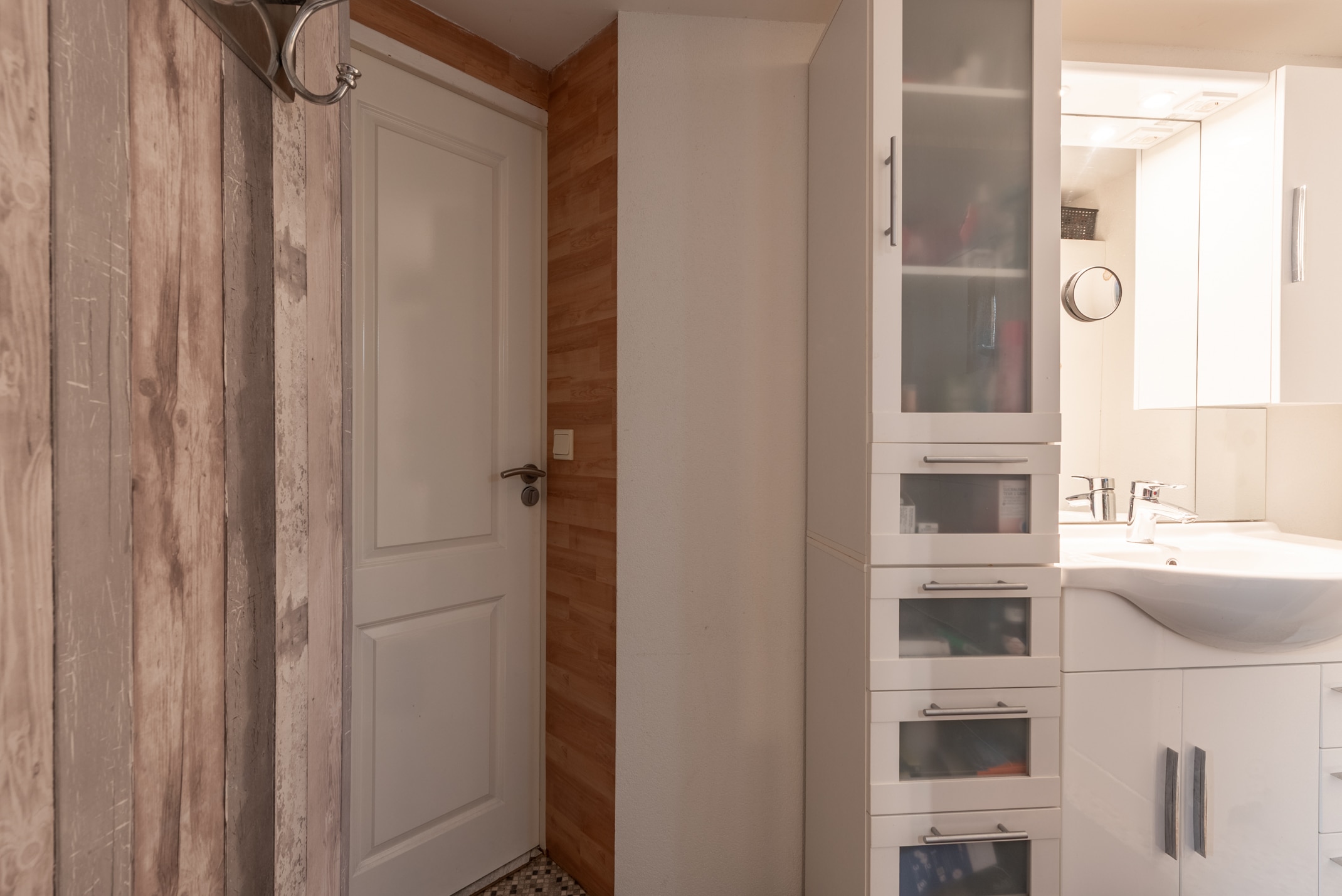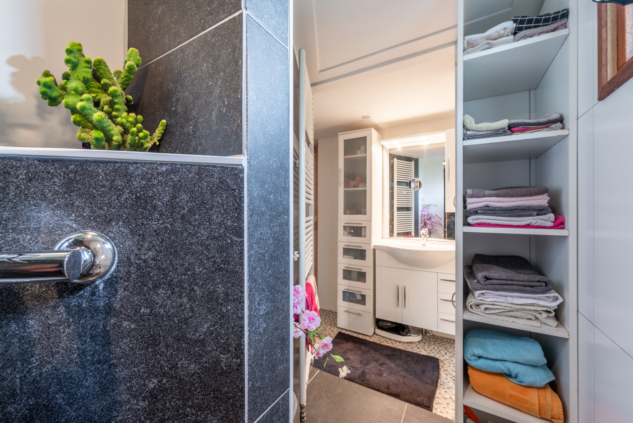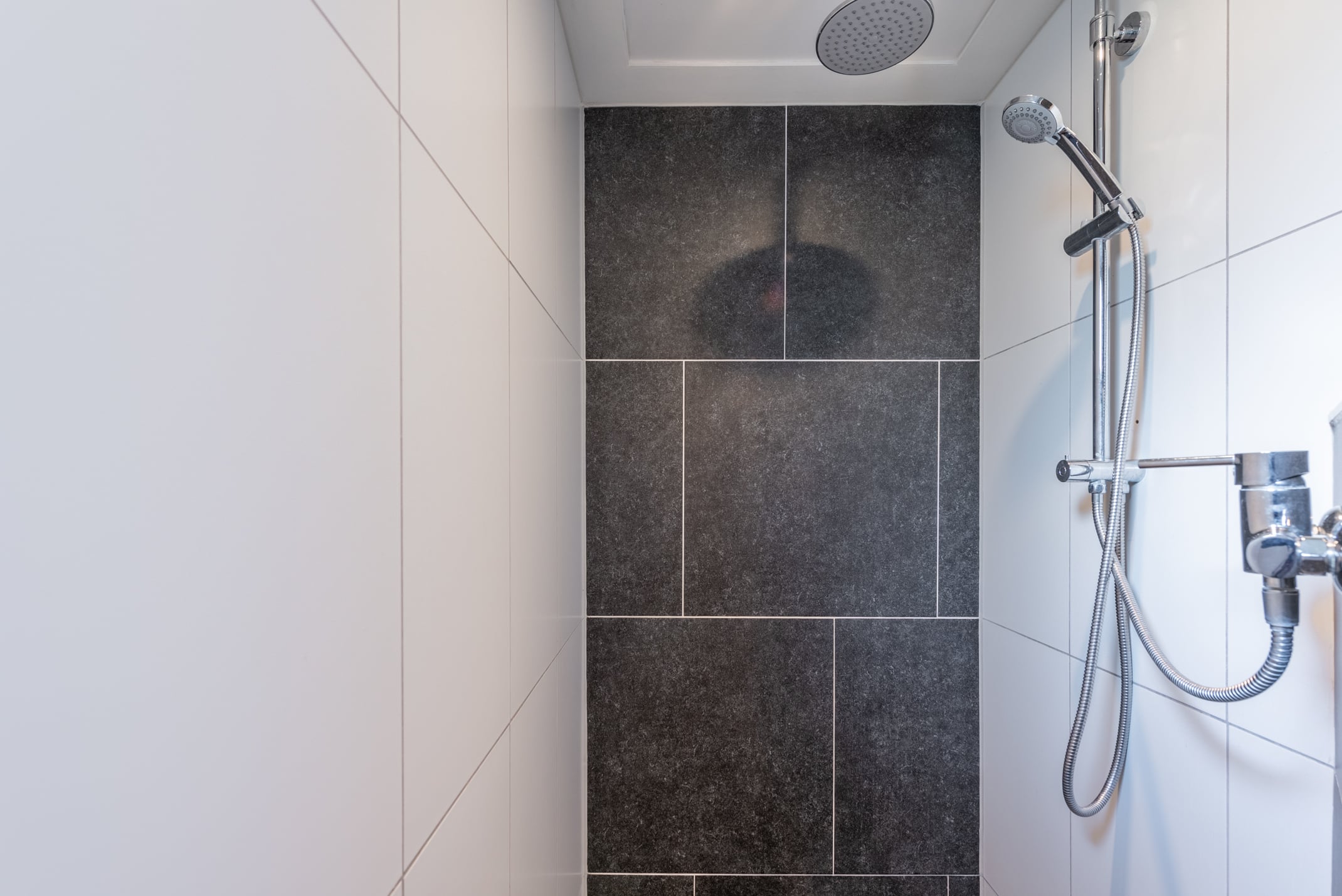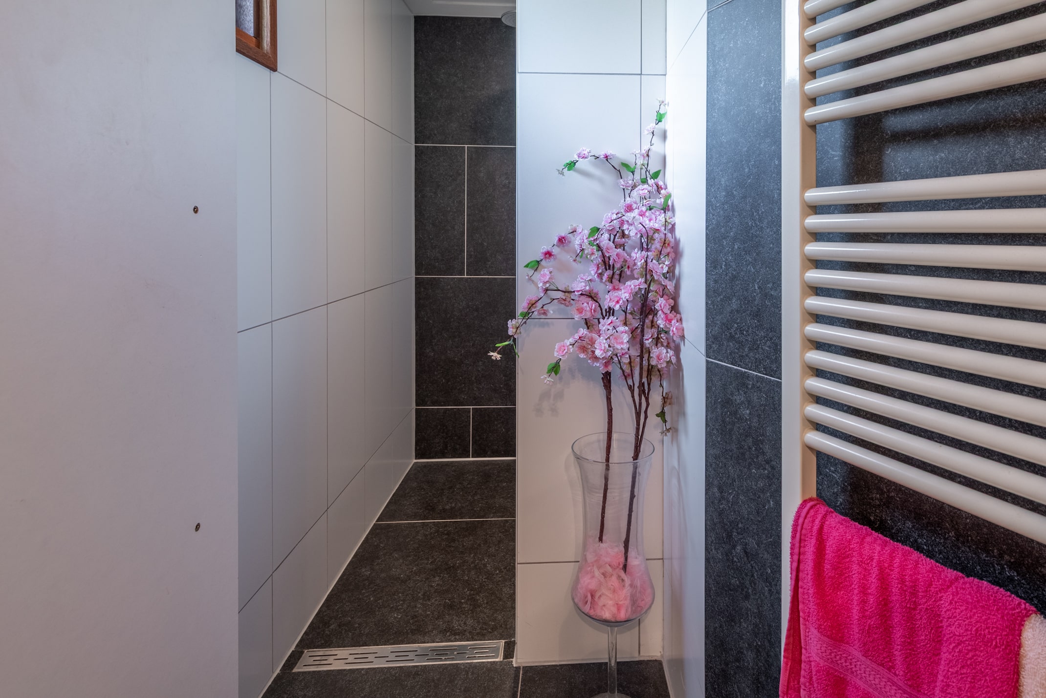 Lopen we naar de uitgebouwde badkamer dan is daar een wastafel meubel en een prachtig doucheruimte voorzien van recentelijk vernieuwde regendouche en een aparte handdouche.